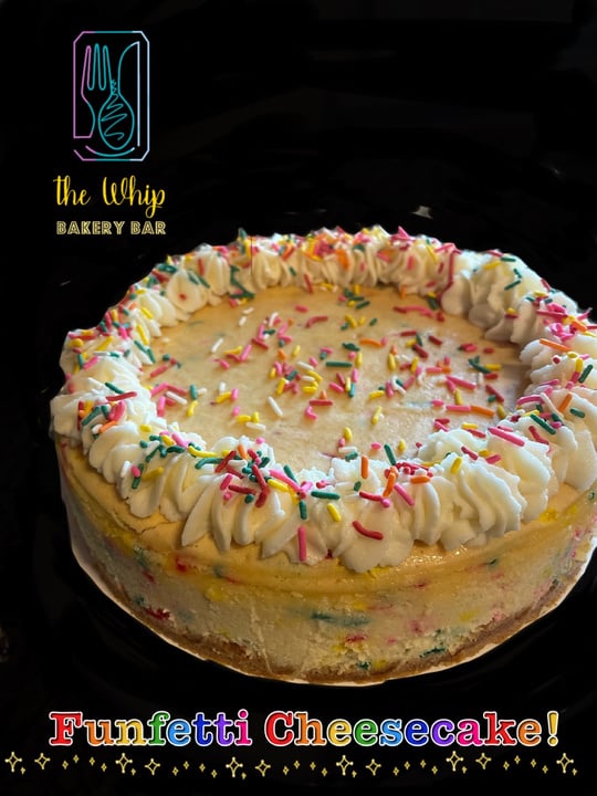 Delicious vanilla cheesecake filled with colorful confetti sprinkles. Topped with fresh made whipped cream and more sprinkles!