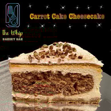 Creamy vanilla cheesecake layered with decadent carrot cake. Topped with whipped cream cheese frosting and toasted pecan pieces.
