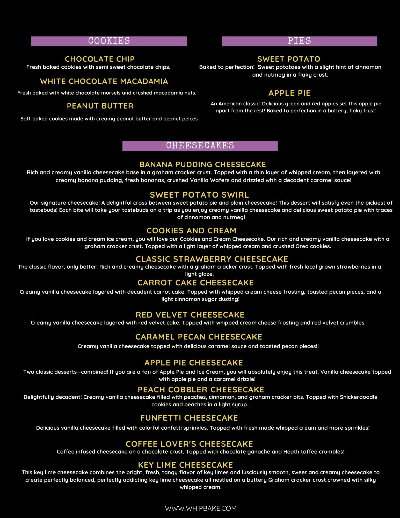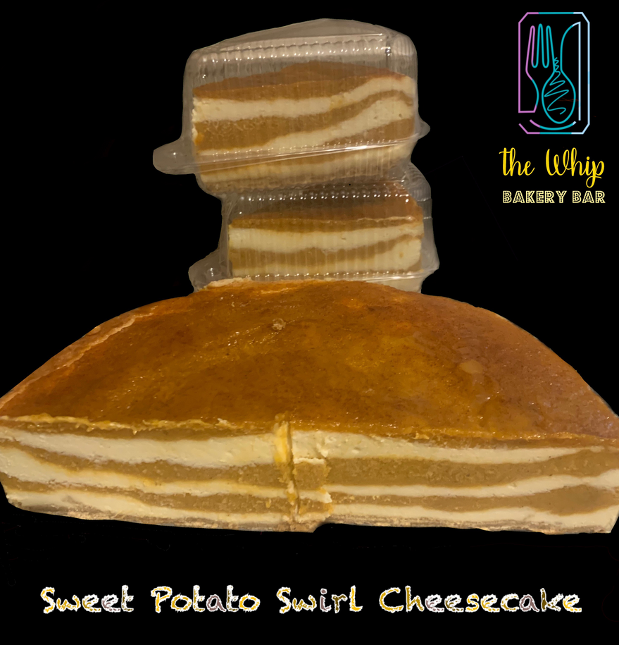 Our signature cheesecake! A delightful cross between sweet potato pie and plain cheesecake! This dessert will satisfy even the pickiest of tastebuds! Each bite will take your tastebuds on a trip as you enjoy creamy vanilla cheesecake and delicious sweet potato pie with traces of cinnamon and nutmeg!