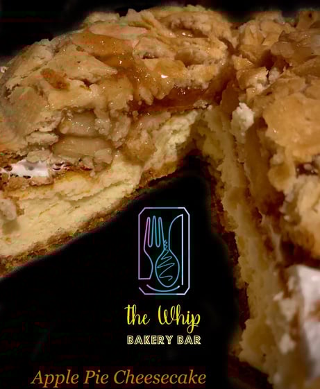 Two classic desserts--combined! If you are a fan of Apple Pie and Ice Cream, you will absolutely enjoy this treat. Vanilla cheesecake topped with apple pie and a caramel drizzle!